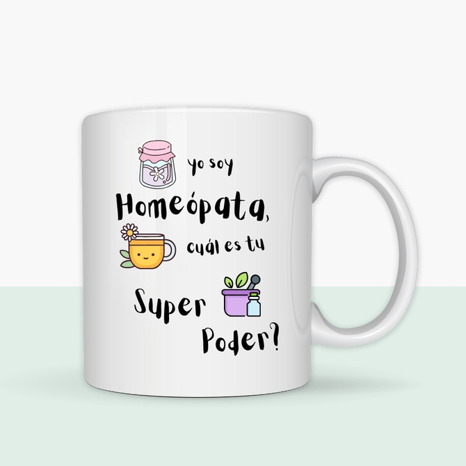 Taza Homeopática Super poder. Estilo Natural con Buen Humor. Disfruta tu bebida favorita con estilo gracias a nuestra taza personalizada de temática homeopática. Con diseños únicos y frases ingeniosas, es el regalo perfecto para amantes de la medicina natural y el buen humor.